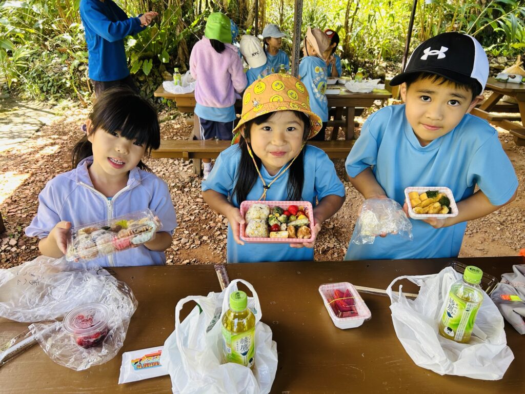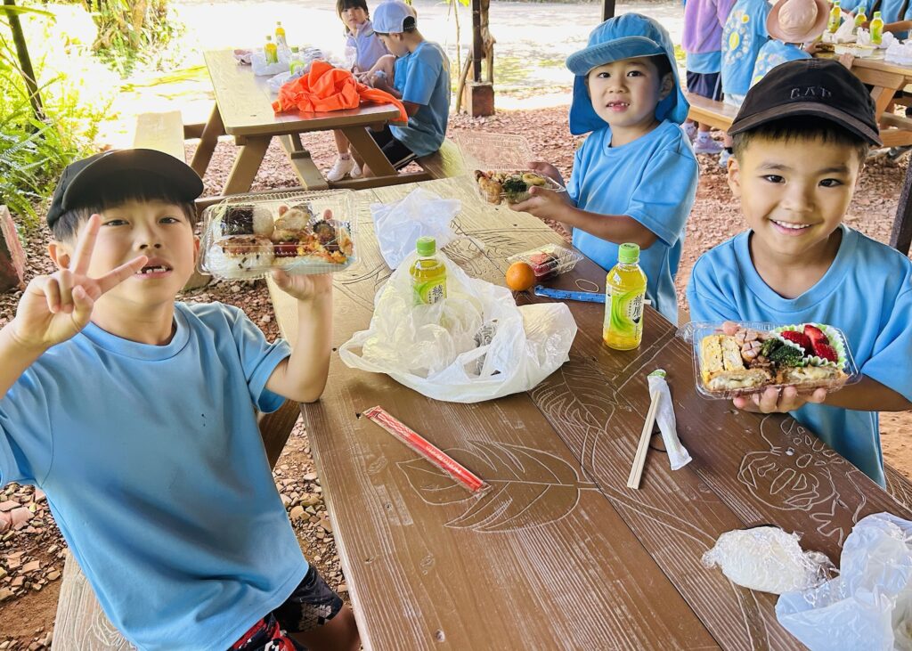 「見て見て!」「美味しいね!」と、みんな自慢のお弁当を広げて、幸せな時間を過ごしました。おやつは、ひんやり冷たいアイスクリームを食べて、エネルギー満タンです!