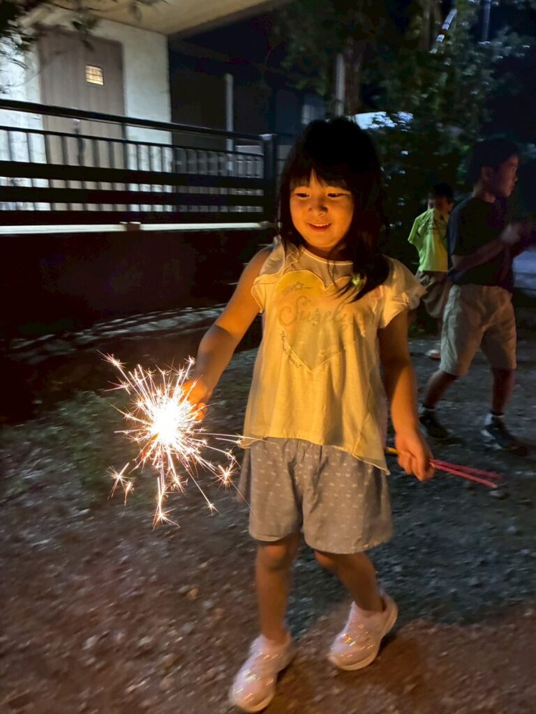 • 夜空に輝く花火: 1日の締めくくりは、みんなで花火を楽しみました。暗闇に光る火花を見つめる子供たちの目は、とても輝いていました。